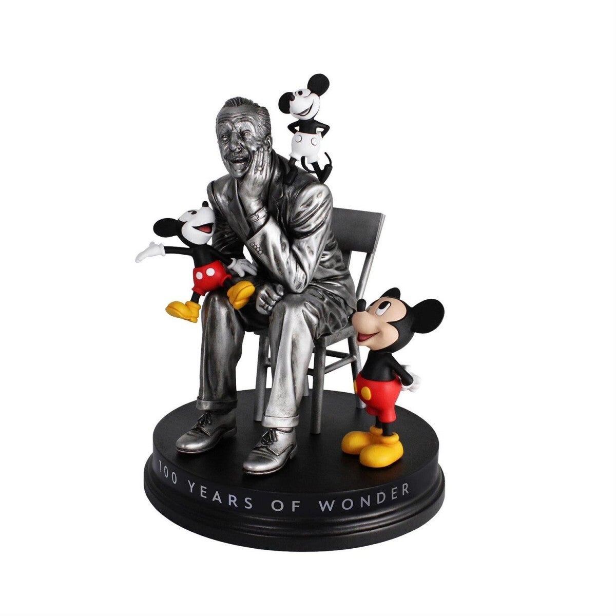 In occasione del centenario Disney, la splendida raffigurazione di Walt Disney seduto su una sedia con Topolino negli anni. Statuina realizzata in resina dipinta a mano. Collezione Disney Grand Jester Studio
