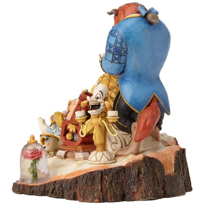 La Bella e la Bestia in scena su un tronco con Cogsworth, Mrs Bric, Chicco e Lumiere. Gruppo in resina dipinto a mano effetto legno, collezione Disney Traditions, ideato dall'artista americano Jim Shore.