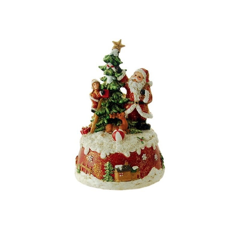 Babbo Natale che decora l’albero. La scena in resina gira al suono di “We wish you a Merry Christmas”. Misure: .Ø9,5x16 cm.