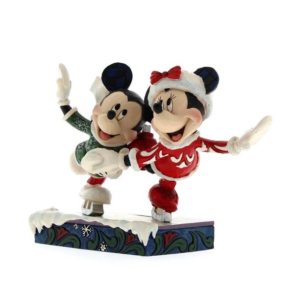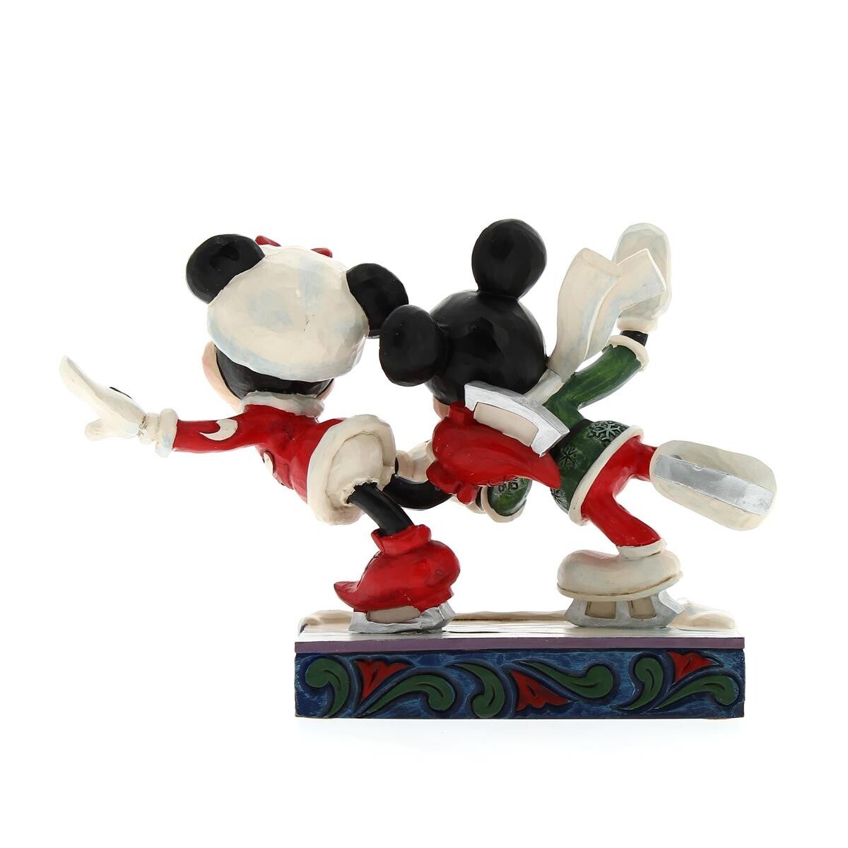 Topolino e Minnie su pattini. Statuina realizzata in resina dipinta a mano effetto legno, ideata dall'artista americano Jim Shore per la collezione Disney Traditions.