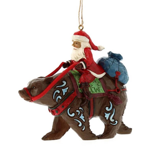 Babbo Natale su orso. Realizzato in resina dipinta a mano effetto legno. Creato dall'artista Jim Shore per la collezione Heartwood Creek.