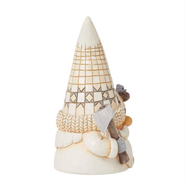 Statuetta Gnomo bianco boscaiolo. Realizzato in resina dipinta a mano effetto legno, creato dall'artista Jim Shore per la collezione Heartwood Creek.