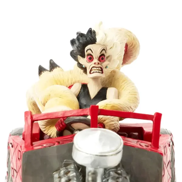 Splendida statuetta per celebrare il 65° anniversario de La Carica Dei 101, raffigurante Crudelia De Mon a bordo della sua auto rossa musicale. Prodotto realizzato in resina dipinta a mano effetto legno, ideato dall'artista americano Jim Shore per la Collezione Disney Traditions.