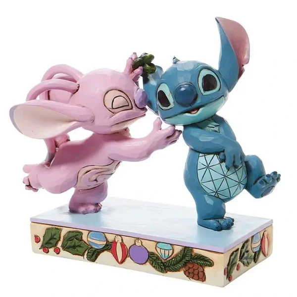 Angel e Stitch sotto il vischio. Statuina realizzata in resina dipinta a mano, effetto legno. Collezione Disney Traditions, ideata dall'artista americano Jim Shore.